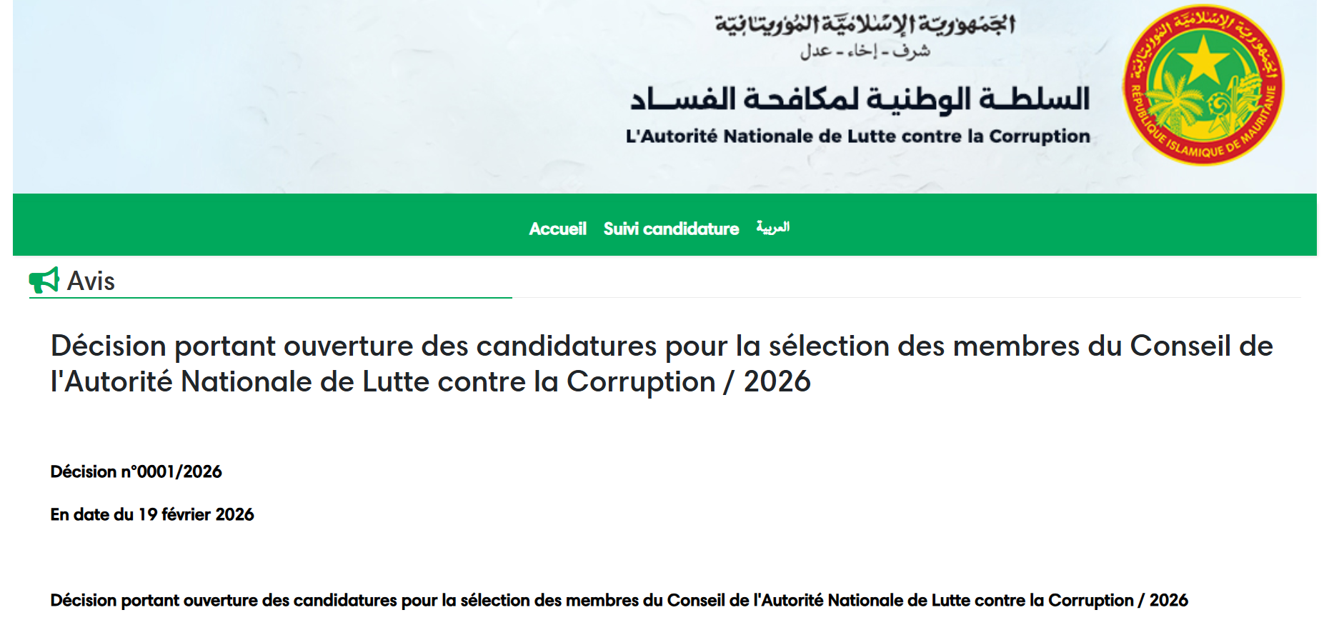 Décision portant ouverture des candidatures pour la sélection des membres du Conseil de l'Autorité Nationale de Lutte contre la Corruption / 2026